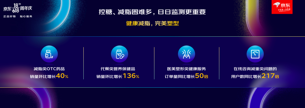 随着夏天的到来,不少人开始有了减脂的动力,消费数据的变化就是有力证明。618期间,京东健康减脂类OTC药品、代餐类营养保健品销售环比上月分别增长了40%和136%;同时,相对去年而言,医美塑形类健康服务订单量同比增长50%、在线咨询减重类问题用户数同比增长217倍。