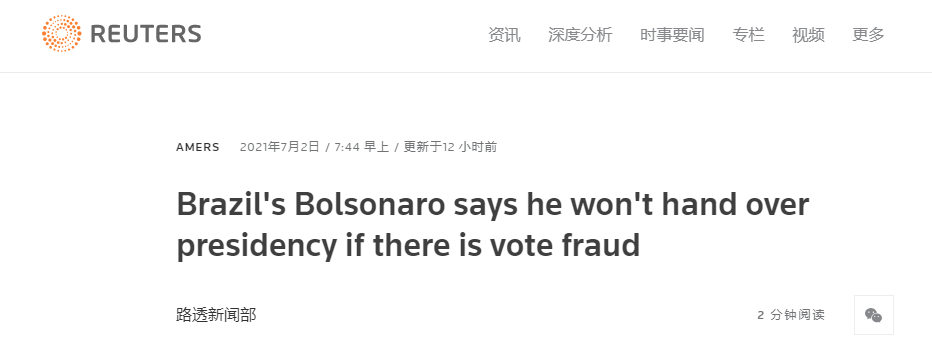 在路透社看来,他的言论几乎无法消除批评者的担忧,他们担心博索纳罗不会接受在明年选举中失败的结果。博索纳罗几乎肯定要面对他的政治对手、巴西前总统卢拉。然而目前民调显示卢拉领先。