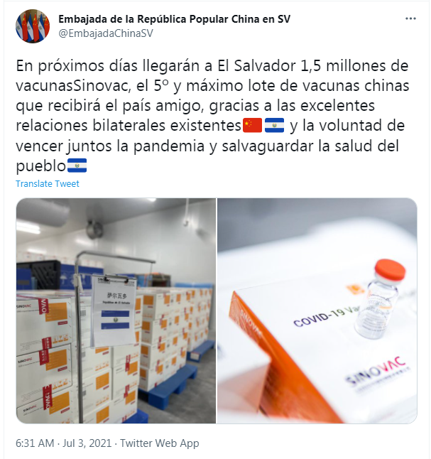使馆在推文中写道,“在接下来的几天里,150万剂科兴疫苗将运抵萨尔瓦多,这是这个友好国家收到的第5批,也是数量最多的一批中国疫苗。这要归功于中萨两国的良好关系,以及共同战胜疫情、维护民众健康的意愿。”