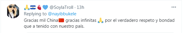 “感谢中国驻萨尔瓦多大使馆。非常感谢(中国)对我们深爱的国家的帮助。”