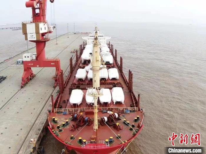 中新网上海12月8日电(记者陈静)8日,装载着21艘国产游艇的马绍尔群岛籍“波罗”号货轮缓缓驶离上海南港码头出境。