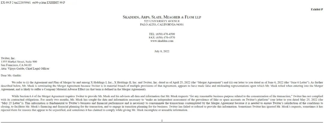 「马斯克正在终止收购协议,因为 Twitter 严重违反了该协议的多项条款,似乎做出了马斯克在签订协议时所依赖的虚假和误导性陈述,并可能遭受公司重大不利影响。」7 月 8 日,一份递交给美国证券交易委员会(SEC)的文件显示,伊隆 · 马斯克正试图退出以 440 亿美元收购 Twitter 的协议。