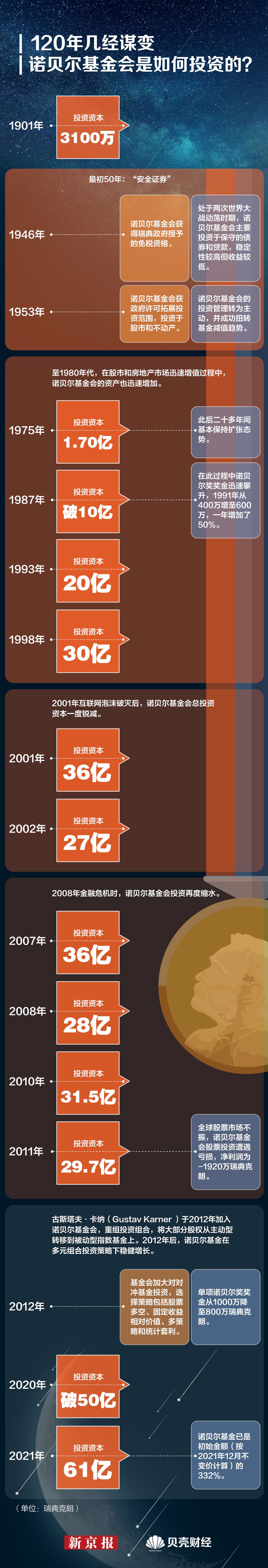 最初的3158.72万瑞典克朗,到目前已增长超196.7倍。根据诺贝尔基金会2021年年报,到2021年底,该基金会总投资资本的市场价值达61.03亿瑞典克朗。