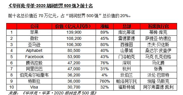 苹果公司以14万亿人民币价值成为世界上最值钱的企业;其次是微软和亚马逊,价值均超过10万亿元。值得注意的是,前十名中有两家中国企业,分别是位列第6的腾讯和位列第7的阿里巴巴。这也是第一次有两家中国企业进入全球十强。