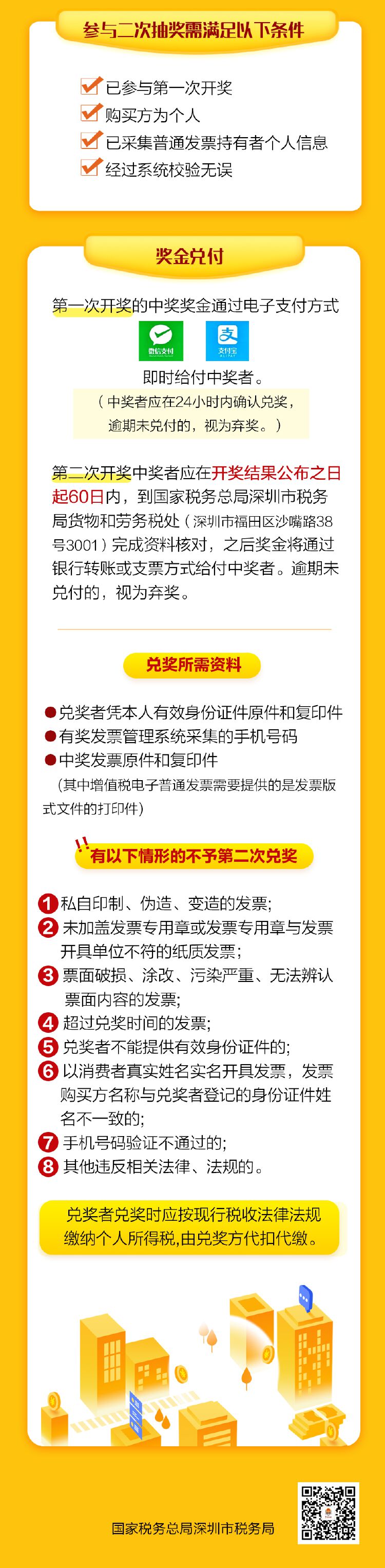此外,第一次即时开奖的中奖奖金将通过电子支付方式即时给付中奖者,中奖者应在24小时内确认兑奖;第二次定期开奖,中奖者需在开奖结果公布之日起60日内,到国家税务总局深圳市税务局完成资料核对,之后奖金将通过银行转账或支票方式给付中奖者,逾期未兑付视为弃奖。