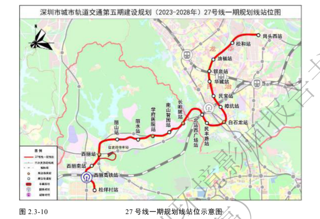 地铁27号线一期,起于松坪村站,终至岗头西站,线路全长约23.2公里,设站19座,全为地下线。该线路是服务科技园、西丽、龙华的普线。强化沿线人口岗位密集区的轨道交通服务,支持坂雪岗科技城、深圳北站中心、南山科技园等重点片区。