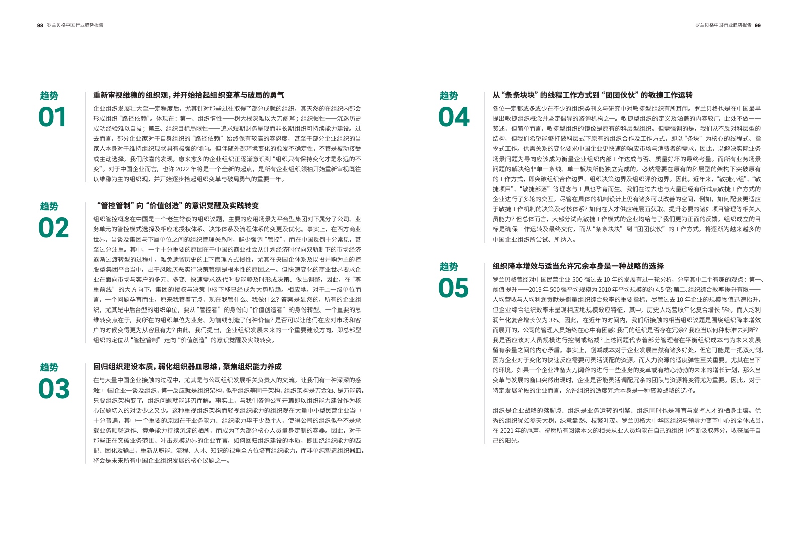 时光匆匆,新冠疫情的影响似乎未曾削弱,同步全球范围内对于地缘政治与宏观经济的整体负向预期,似乎不断向中国商业界传递着一种相对悲观的未来展望。在这一年中,我们看到了不同行业的诸多颠覆变化:教培行业一夜凛冬、房地产行业断臂求生、汽车行业新能源革命如火如荼、能源与传统制造行业头悬绿色的达摩克里斯之剑、消费品与零售行业正酝酿一场可预见的品牌与头部KOL的未来战争、互联网行业经历政府监管的生死时速…同时,虚拟货币、元宇宙、碳排放等全新理念正全然启幕…所有过去一年所发生的,最终都向中国的企业家们传递着这样一种信号:紧迫性与不确定性在未来将愈发频繁。因此,我们不禁自问,未来中国的企业组织应如何变革以强化自身短期的应变性及中长期的适应性?罗兰贝格在过去一年服务了大量的中国企业,在与众多企业家沟通的过程中,我们深切地感受到中国商业生态的操盘手们在组织管理及变革上的非凡觉醒及迫切需求,亦是在这样的背景下,罗兰贝格斗胆提出中国企业组织管理的5个方向,虽不成体系,但以期与各位共思、共勉。