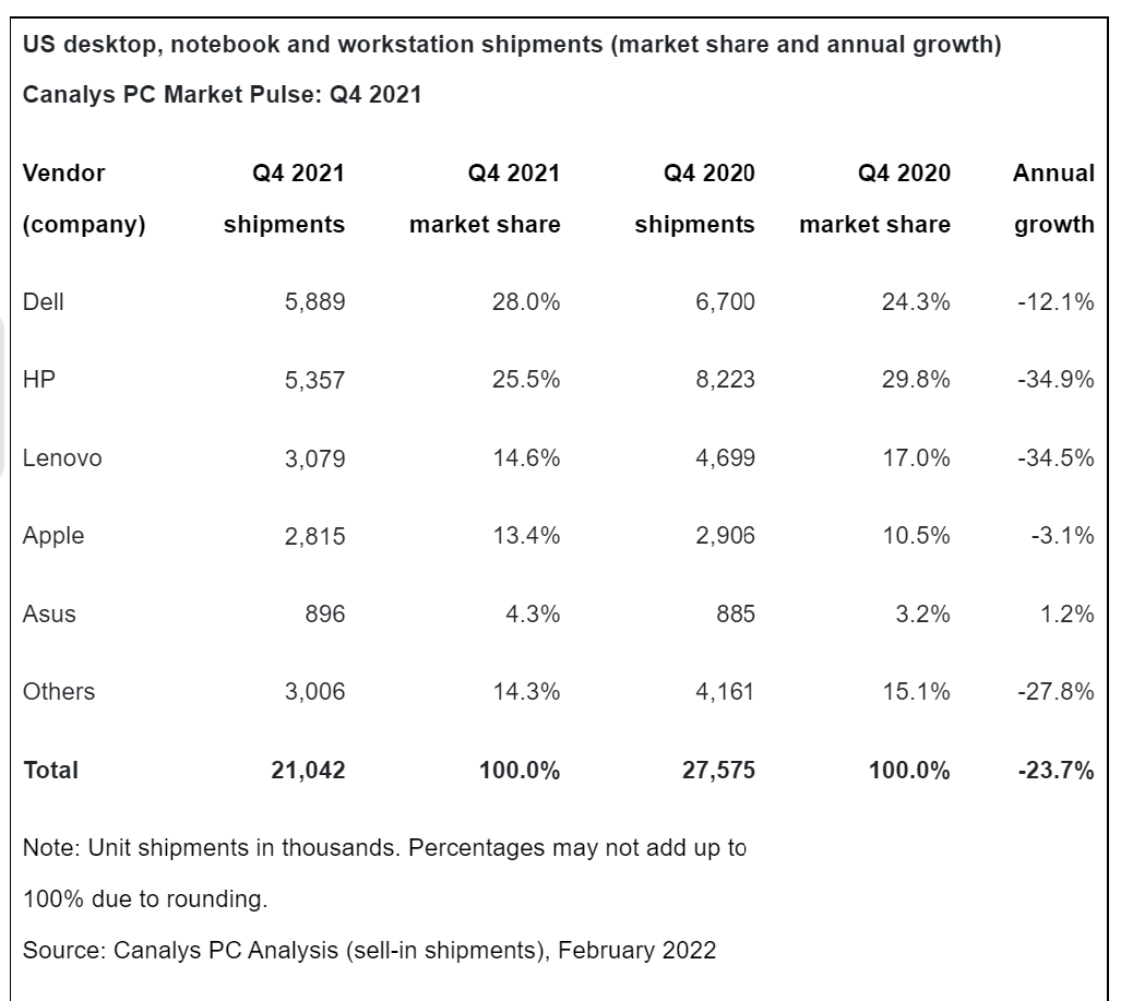 Canalys:2021年第四季度美国PC出货量仅3380万台 同比下降28%