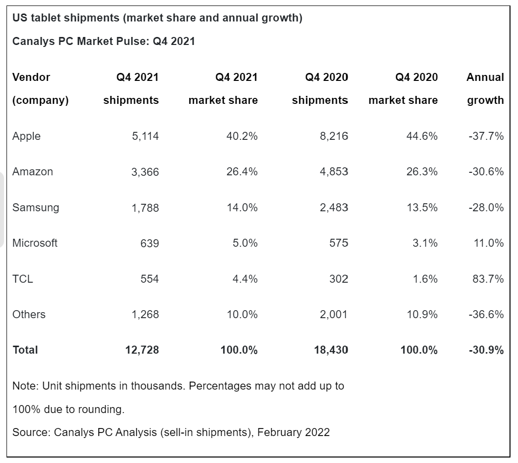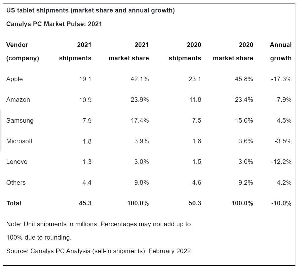 在平板电脑方面,苹果在第四季度和全年都保持了主导地位,到2021 年底,iPad出货量为1910万台,比2020年下降了17%。亚马逊和三星分别以1090万台和790万台位居第二和第三。与2020年同期相比,两者假日购物季需求都相对疲软。微软和联想在2021年平板电脑市场分别排名第四和第五。