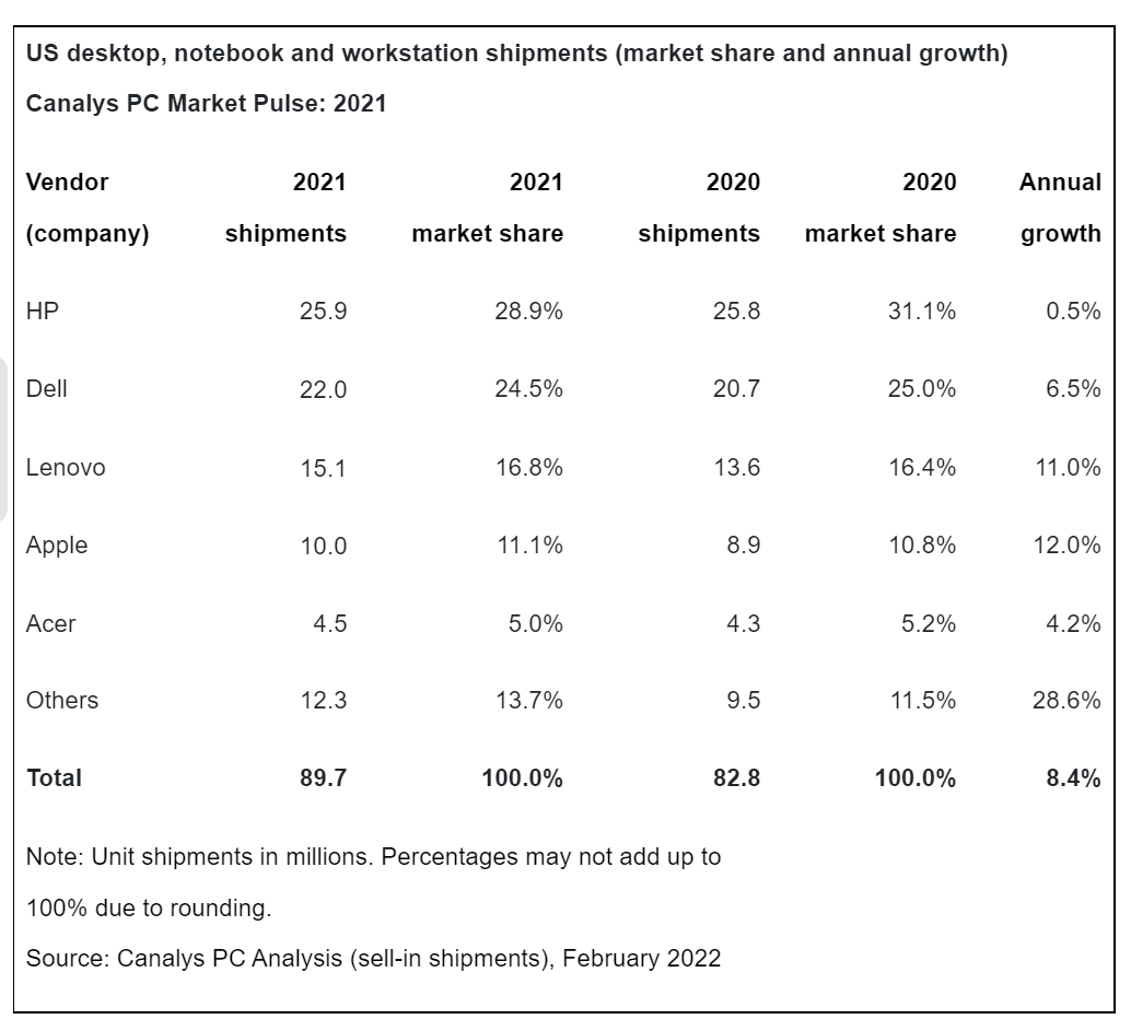 在不包括平板电脑的个人电脑市场,惠普在 2021 年全年领先,这得益于Chromebook市场的强劲地位。随着时间的推移,戴尔势头强劲,并在第四季度位居榜首,全年出货量为 2200 万台,位居第二。联想位居第三,2020 年增长11%。苹果和宏碁位列前五,均在2020年实现增长。