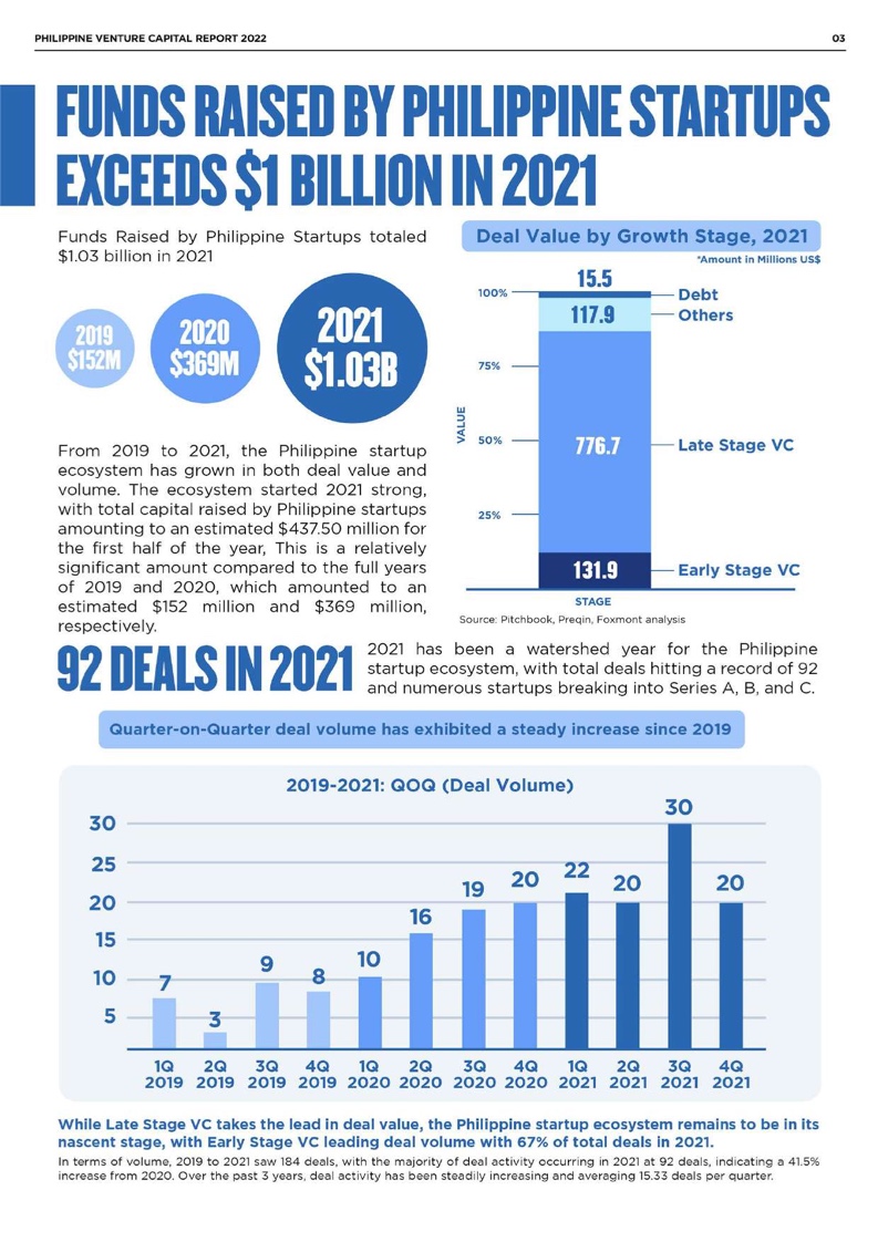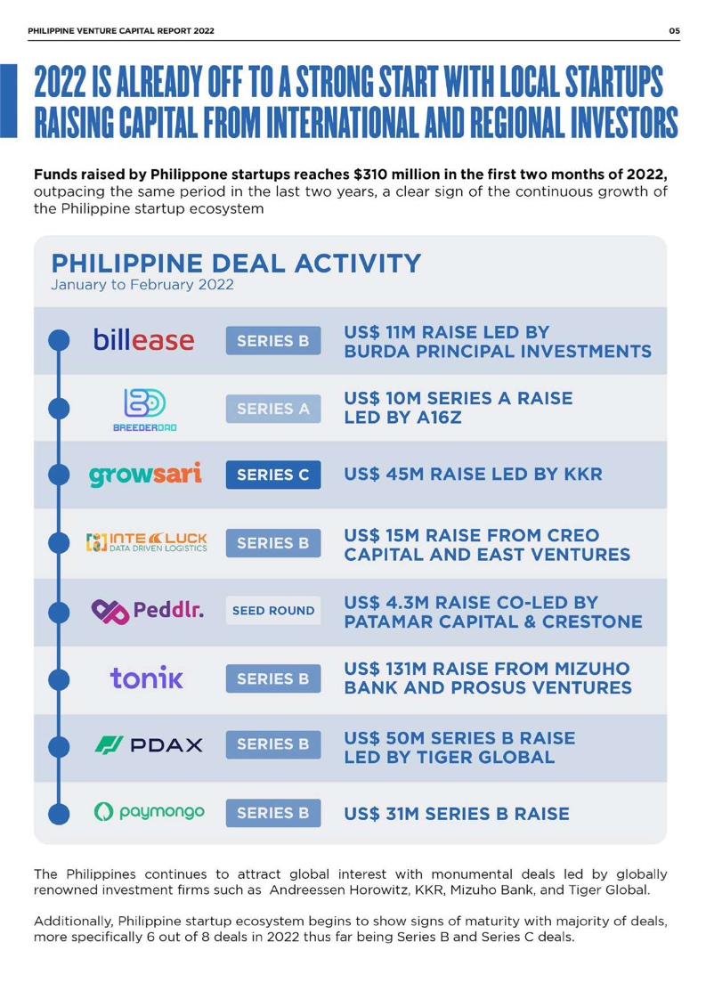 Foxmont Capital Partners 还在报告中强调了菲律宾初创公司在 2022 年取得的成就。在 2022 年的前两个月中,菲律宾本土初创公司的融资总额已达到 3.1 亿美元(约 19.68 亿人民币),远超过去两年同期。Foxmont 表示,这表明菲律宾初创生态系统展现了”持续增长的明显迹象”。