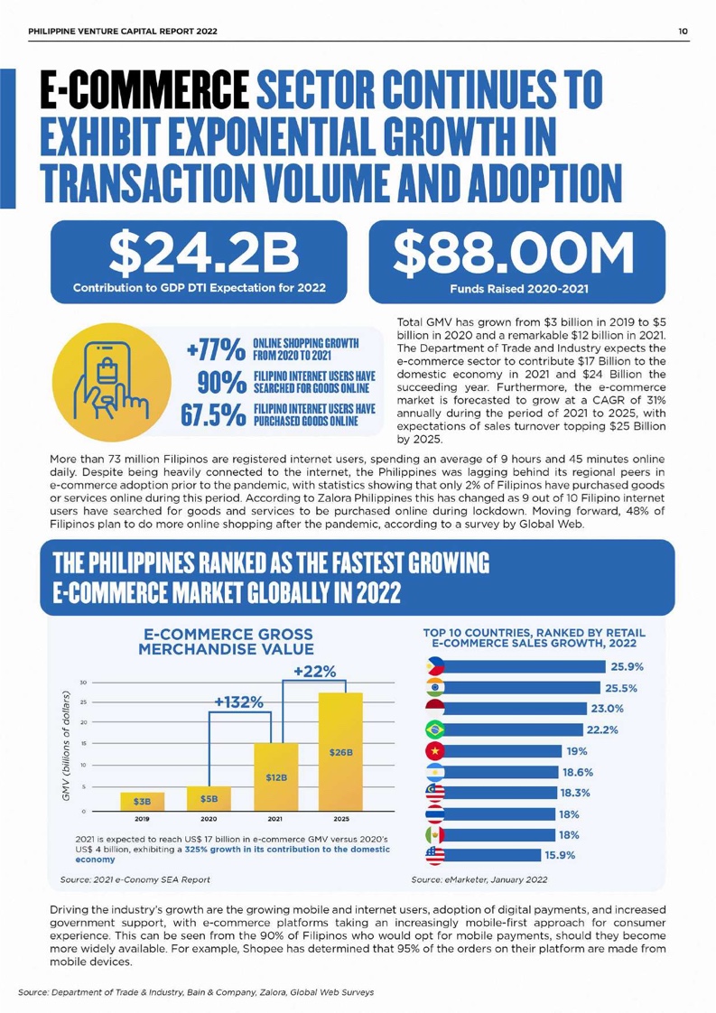 对于电商垂类市场而言,电商初创企业的融资总额从 2020 年到 2021 年增长了 77%,这主要得益于新冠疫情带来的封城措施所引发的购物需求上涨。菲律宾贸易和工业部表示,电商产业将在 2021 年为菲律宾国内经济贡献 170 亿美元(约 1079 亿人民币)的营收,并将在下一年上升至 240 亿美元(约 1523 亿人民币)。