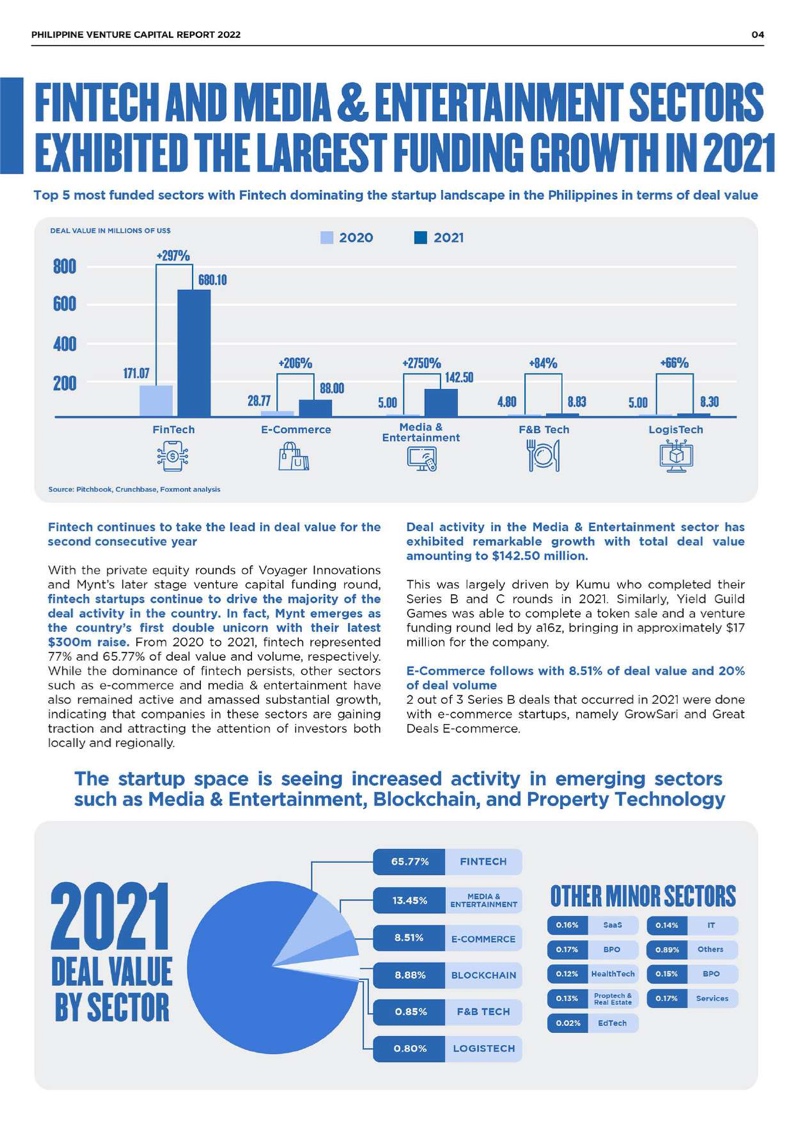 此外报告还表明,金融科技以及娱乐初创企业在 2021 年的融资总额增幅最大。金融科技垂类市场中的融资额增长主要由 Mynt 的融资交易所推动,而娱乐垂类市场中的主要增长贡献者则为 Kumu。