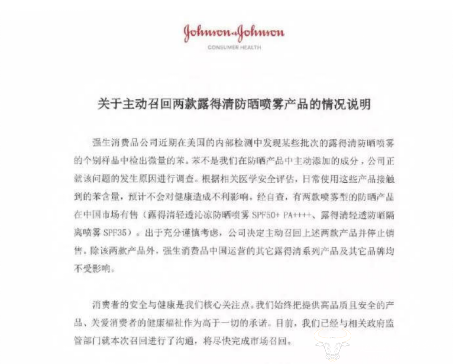 强生(中国)表示,“强生消费品公司近期在美国内部检测中发现某些批次的露得清防晒喷雾的个别样品中检出微量的苯。根据相关医学安全评估,日常使用这些产品接触到的苯含量,预计不会对健康造成不利影响。”
