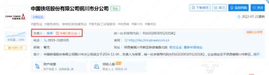 运营商财经网还发现,企查查搜索结果显示,中国铁塔铜川分公司的法定代表人目前仍是柴军,而这显然是网站信息录入的错误,柴军早就被调走了。