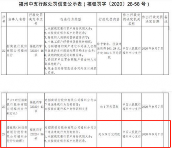 2020年9月7日,福州中支行政处罚信息公示表显示,招行福州分行因未按规定履行客户身份识别义务;未按规定保存客户交易记录;存在引人误解的营销宣传内容;个体工商户经营性贷款统计错误;