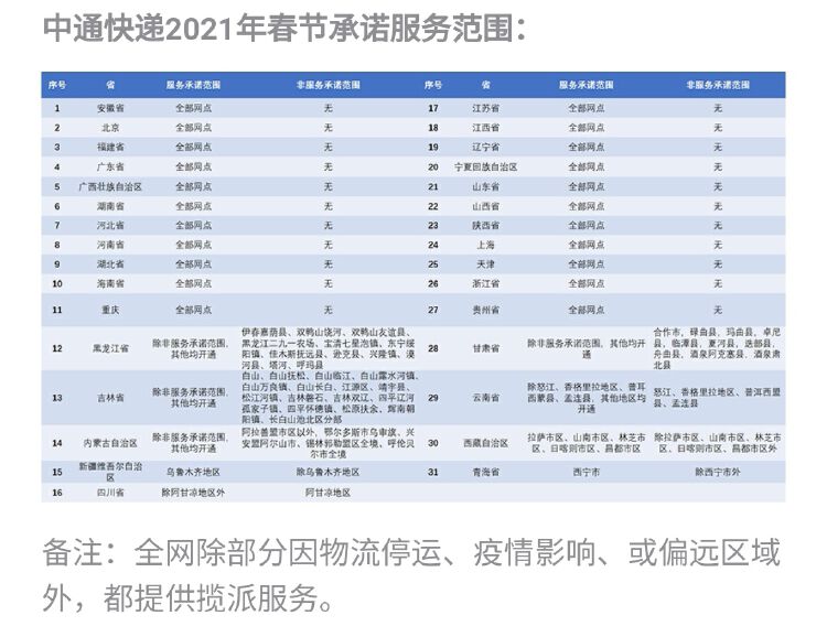 圆通速递称,2月4日至2月19日,圆通国内、国际将继续提供寄递服务,除西藏外,圆通在全国各省(区、市)正常揽派(新疆限于乌鲁木齐、青海限于西宁),而且将重点区域时效保障服务范围扩大到全国209个城市,全国省会城市全覆盖。