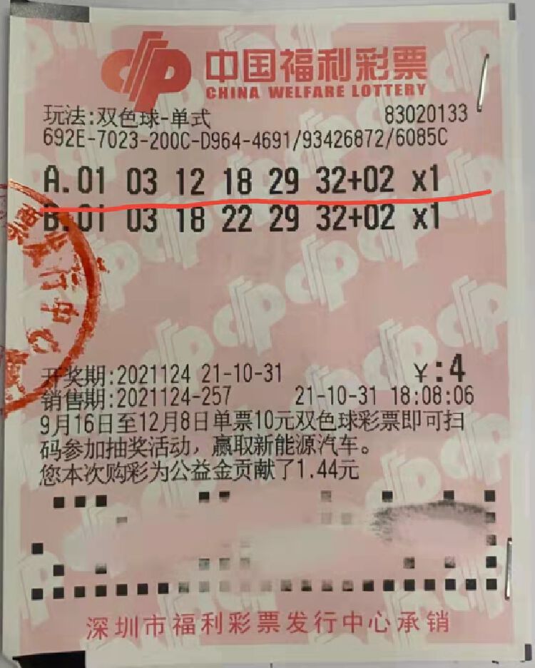 陈先生是双色球第2021124期一等奖得主,中奖票分别为一张4元单式票和一张10元单式票,出自南山区蛇口街道蛇口渔村路58-1号83020133投注站。