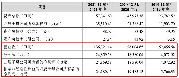 招股书财报显示,睿联技术2019年、2020年和2021年营收分别为5.25亿元、9.60亿元和13.67亿元,年均复合增长率为61.44%;净利润分别为4072.92万元、1.86亿元和2.49亿元,扣非后净利润分别为5766.33万元、1.95亿元和2.42亿元。