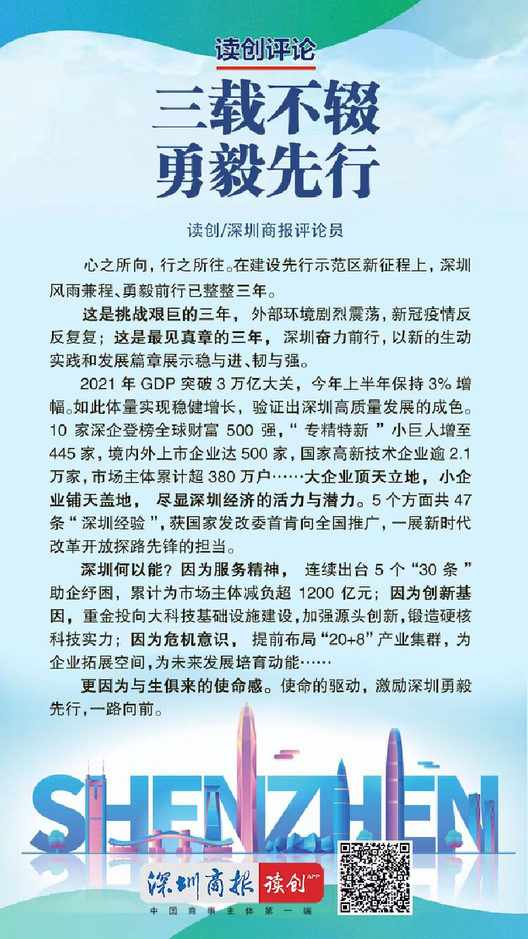 读特客户端·深圳新闻网2022年8月18日讯(读创/深圳商报评论员)心之所向,行之所往。在建设先行示范区新征程上,深圳风雨兼程、勇毅前行已整整三年。