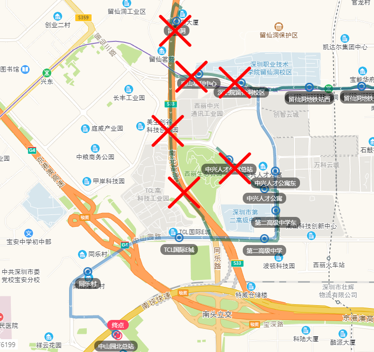 往皇岗口岸方向取消“中兴工业园一号岗、中兴工业园二号岗”等2个单边停靠站,往中山园北总站方向取消“深职院留仙洞校区、南山福利中心、留仙洞、中兴人才公寓”等4个单边公交停靠站。