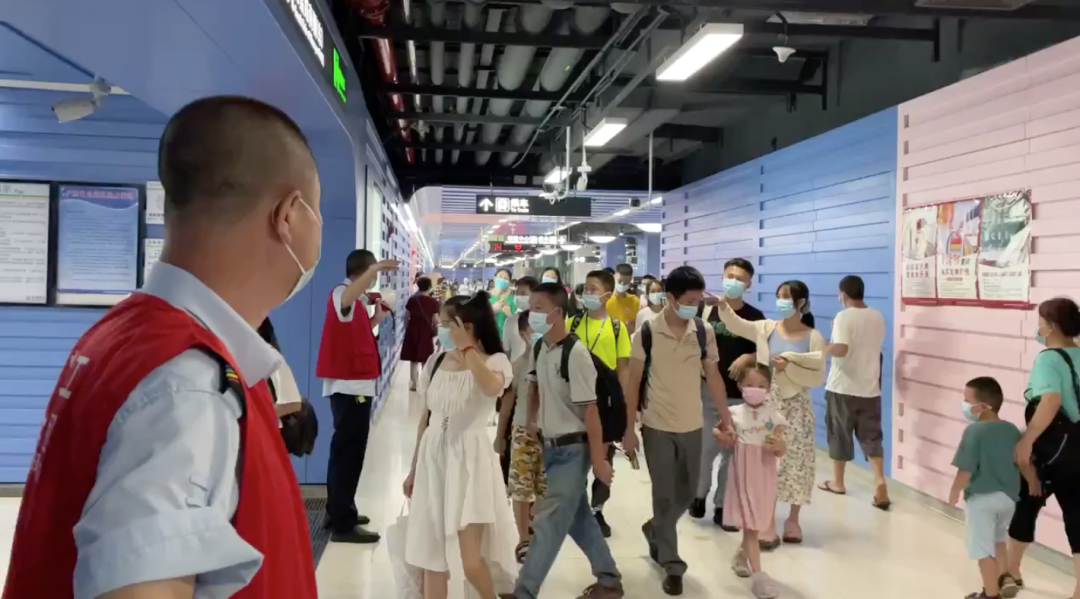 盐田港西路地铁站内,在义工的指引下,游客有序的前往地铁B出口乘坐大梅沙接驳巴士。