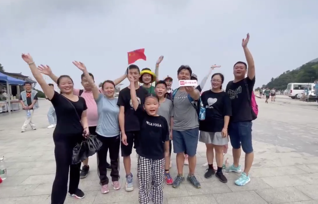 登顶好汉坡的市民,自发放起了红旗飘扬的伴奏。