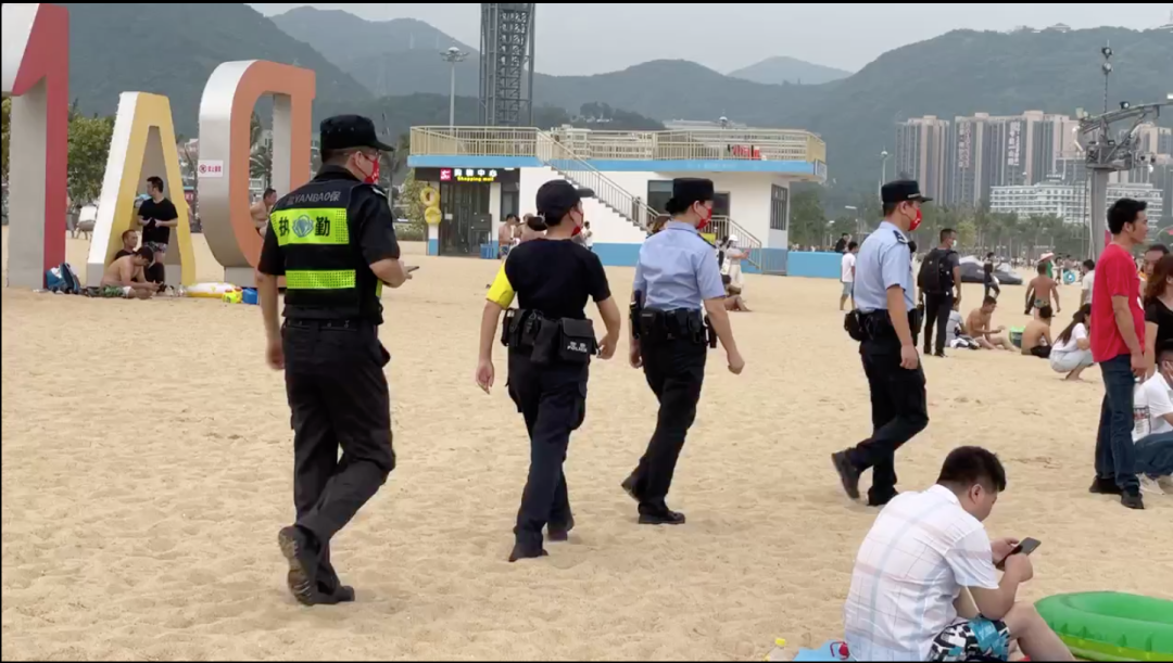 为让游客们更安全放心游玩,公安人员在沙滩边巡逻。