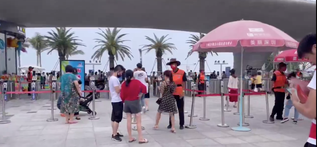 大梅沙海滨公园入口处,根据防疫要求,旅客们出示粤康码和疫情防控行程码排队进入景区。