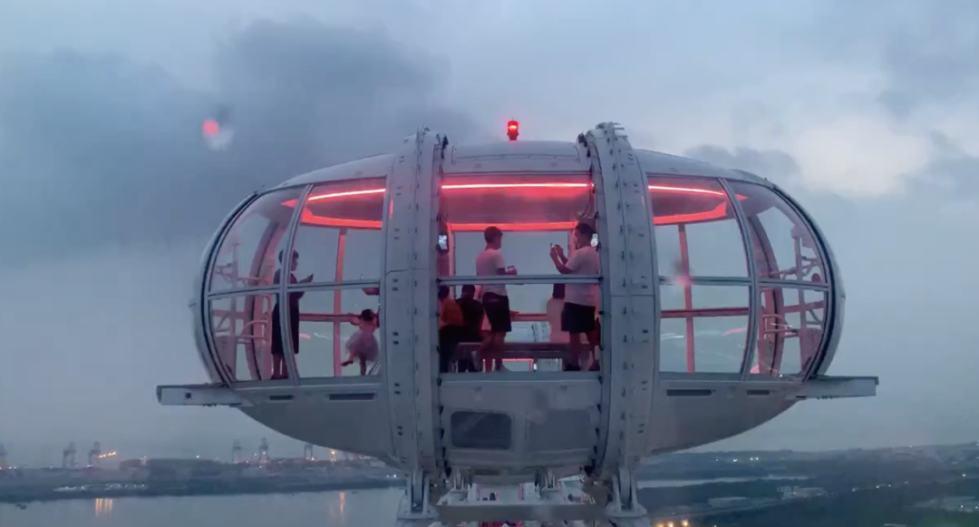 去往摩天轮的游客集聚,傍晚的欢乐港湾,色彩斑斓。