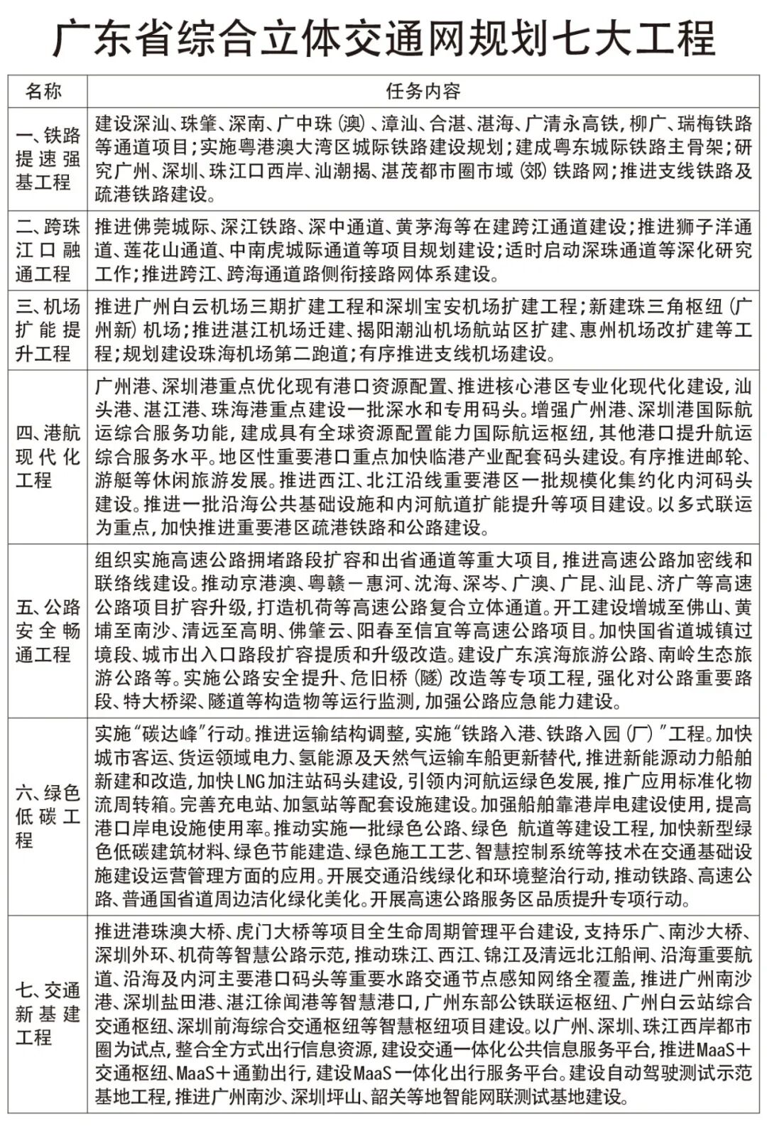 建成高效便捷的综合交通枢纽系统方面,《规划纲要》提出推动深圳港建成世界一流港口;打造以广州白云、深圳宝安、珠三角枢纽(广州新)3个机场为核心,面向全球的国际航空枢纽机场;研究深圳宝安机场溢出效应,通过多种方式增加有效供给;优化粤港澳大湾区口岸功能定位,积极推进深圳皇岗、罗湖、深圳湾、沙头角等老口岸改造升级,完善口岸功能;形成以广州、深圳为全国性铁路枢纽,珠西、汕潮揭、湛茂为区域性铁路枢纽,韶关、梅州、惠州、东莞等为地区性铁路枢纽的“2+3+4”铁路枢纽布局。