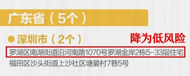 南湖街道沿河南路1070号罗湖金岸2栋5-33层住宅调整为低风险区域。
