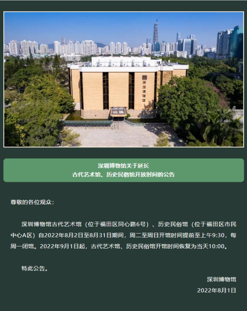 8月1日,深圳博物馆发布《关于延长古代艺术馆、历史民俗馆开放时间的公告》,深圳博物馆古代艺术馆(位于福田区同心路6号)、历史民俗馆(位于福田区市民中心A区)自2022年8月2日至8月31日期间,周二至周日开馆时间提前至上午9:30,每周一闭馆。2022年9月1日起,古代艺术馆、历史民俗馆开馆时间恢复为当天10:00。