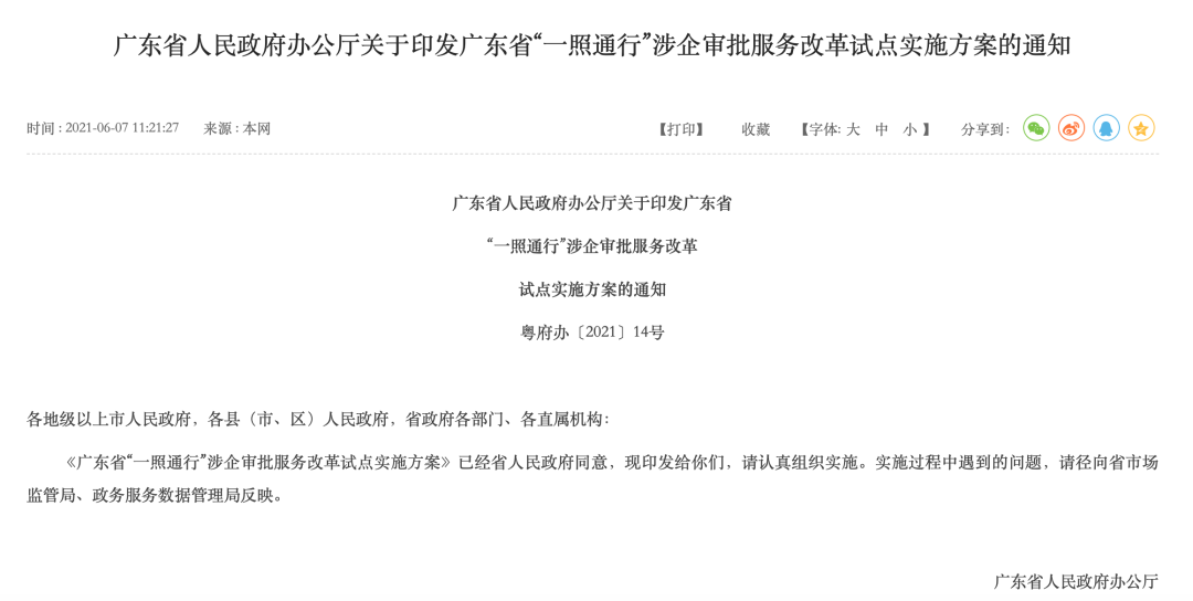 6月7日,《广东省“一照通行”涉企审批服务改革试点实施方案》(下称《方案》)印发。《方案》提出,2021年5月底前在广州、深圳、珠海、佛山、东莞、中山等地试点开展“一照通行”改革,12月底前试点城市完成第一批14项改革事项,并在全省范围启动“一照通行”改革。