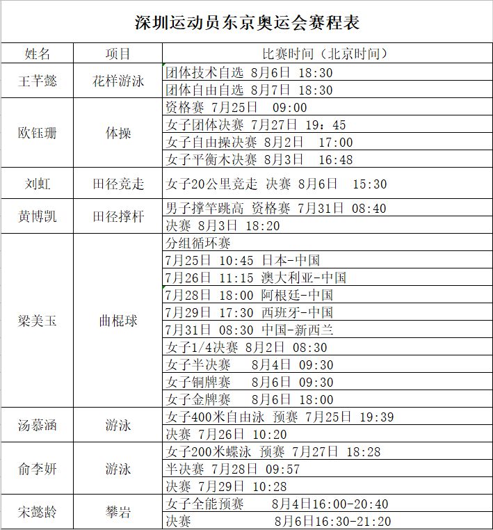 冲金有看点!深圳运动员东京奥运会赛程表出炉