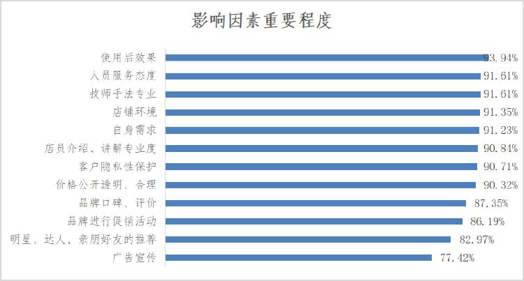 调查结果还发现,超过80%的消费者单次在SPA馆花费在201-500元之间,而单次花费在0-100元以及1000元以上的消费者占比相对较少,分别为1.29%和0.77%;在消费时间上,超过三分之二的消费者更愿意在周末空闲时间来SPA馆品牌进行消费体验;其次是选择在工作日前往,该部分占比为17.16%。在具体消费时间段上,54.84%的消费者更倾向于在17:01-21:00前往SPA馆消费体验;各影响因素对消费者重要程度的研究分析,有93.94%的消费者认为“使用后效果”对前往SPA馆消费的影响程度较高,排名第一;其次是“技师手法专业”和“人员服务态度”,均为91.61%;“广告宣传”对消费者的重要程度相对较低,仅为77.42%等。