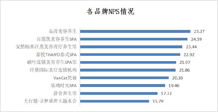 调查发现,SPA馆品牌整体NPS净推荐值高。10个SPA馆品牌的平均NPS净推荐值为21.33,行业整体消费者口碑较好,各品牌推荐度差异不大。晶滢美容养生NPS净推荐值排名第一,为25.27,主要推荐因素是SPA馆服务的专业性、门店环境和服务态度,其次是百莲凯美容养生SPA馆,为24.59;其他SPA馆品牌推荐值均在15-24之间。