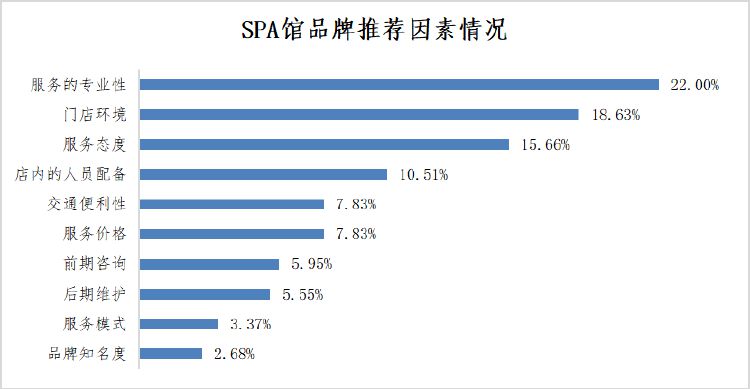 调查还发现,消费者推荐SPA馆品牌的首要因素是品牌服务专业性。本次调查中,消费者推荐SPA馆的首要原因是“该品牌服务的专业性”,推荐比例为22.00%;其次是“门店环境”,为18.63%,说明消费者对于SPA馆的服务专业性最为看重,专业的业务知识、娴熟的按摩手法等会令消费者更有消费意愿。