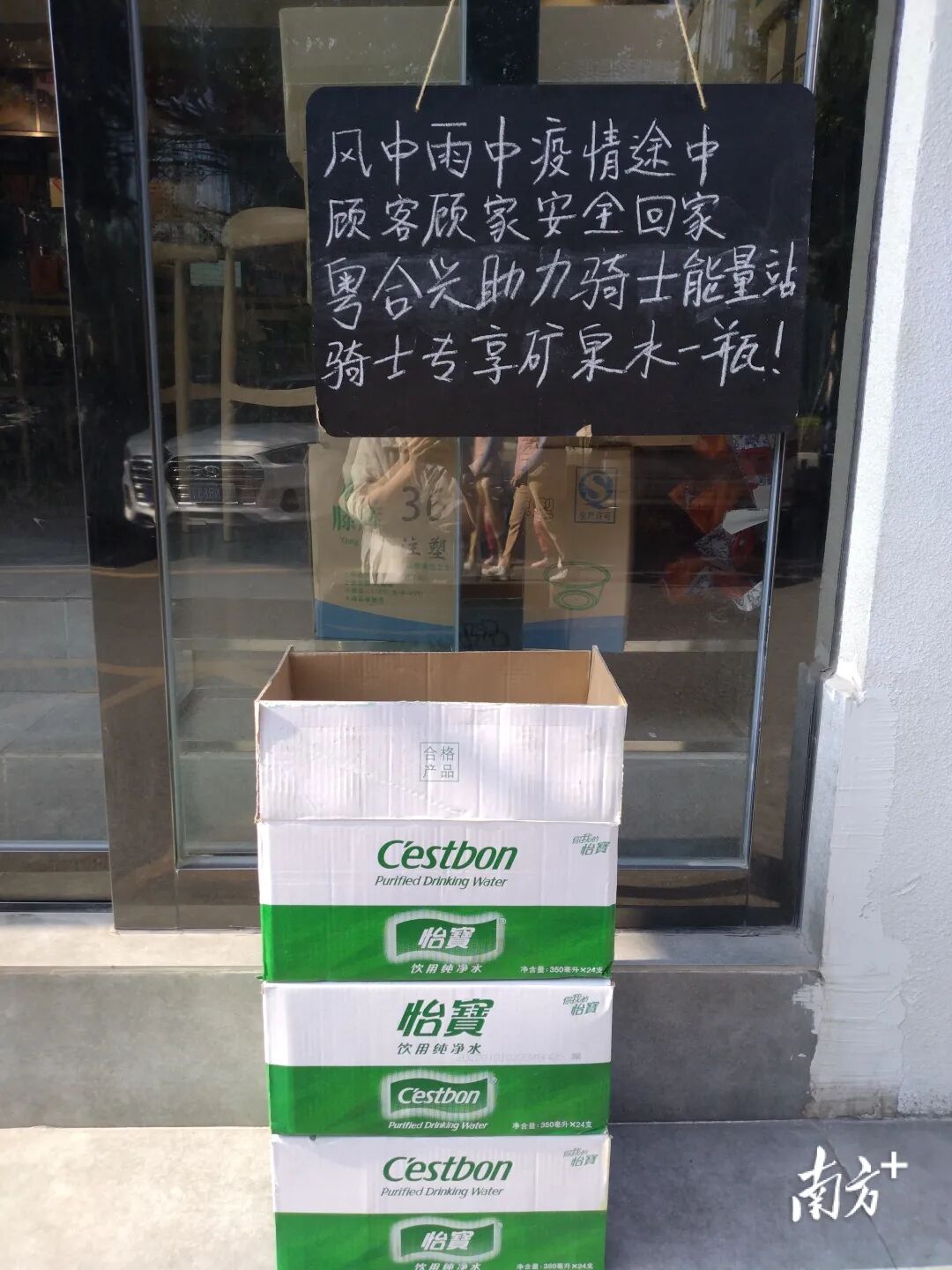 在龙岗区坂田街道禾坪岗康乐广场核酸采样点,一家名为“粤合兴猪脚饭”的店铺挂出小黑板,免费向排队核酸检测的市民送水,用自己的方式为深圳加油。