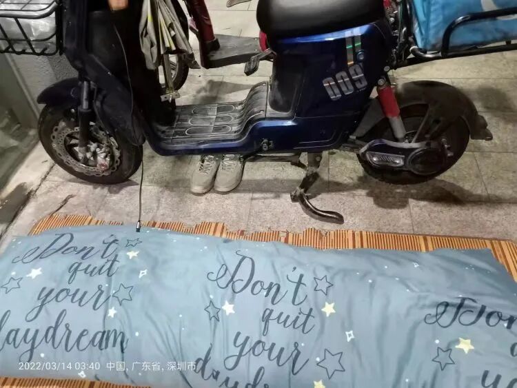 3月份的深圳已有人穿起了短袖,蚊子也开始多了起来。“嗡嗡……”夜晚11点钟,蚊子一直在刘阳耳边回荡,但蚊子还是没能把他吵醒。从早晨9点钟配送到晚上9点钟,刘阳工作了整整12个小时。“说不疲惫是假的……”刘阳表示,由于室外不具备洗澡条件,他没法洗个澡来缓解一天的疲惫,这是最大的“遗憾”。