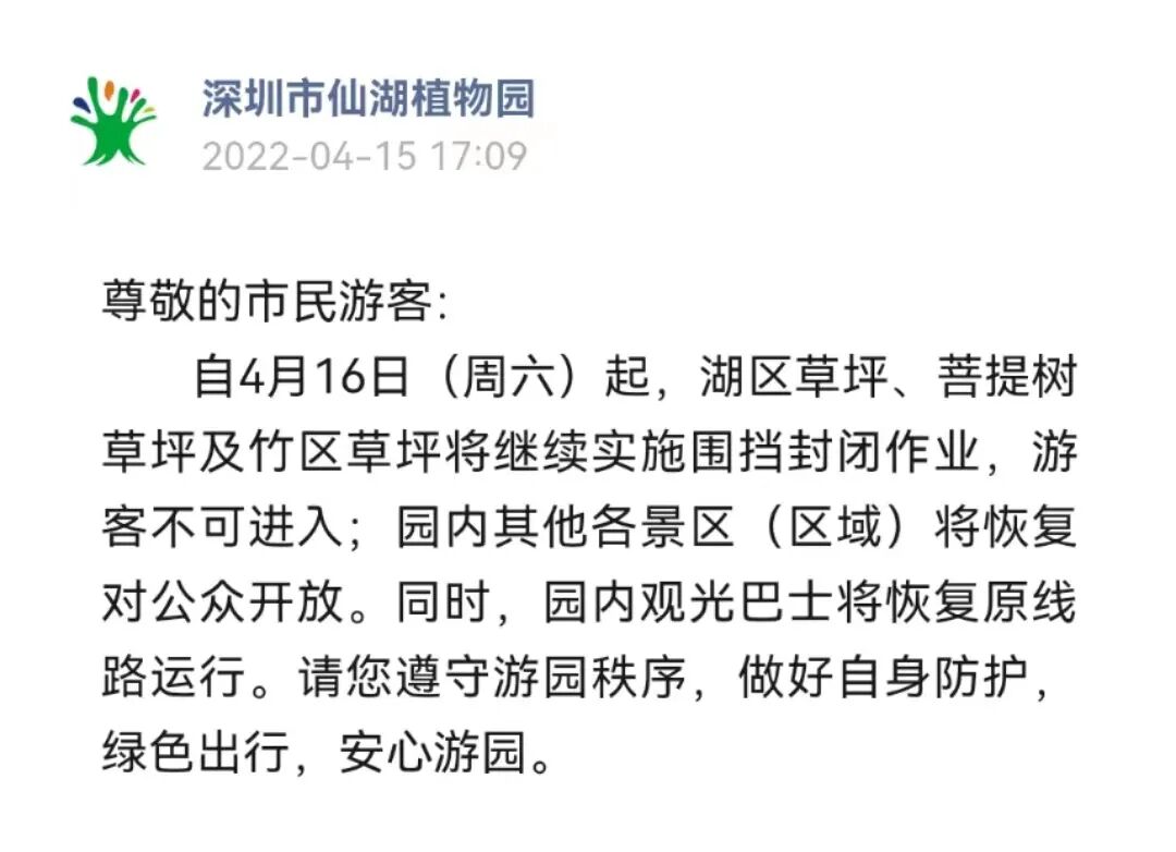自4月16日(周六)起,湖区草坪、菩提树草坪及竹区草坪将继续实施围挡封闭作业,游客不可进入,园内其他各景区(区域)将恢复对公众开放;