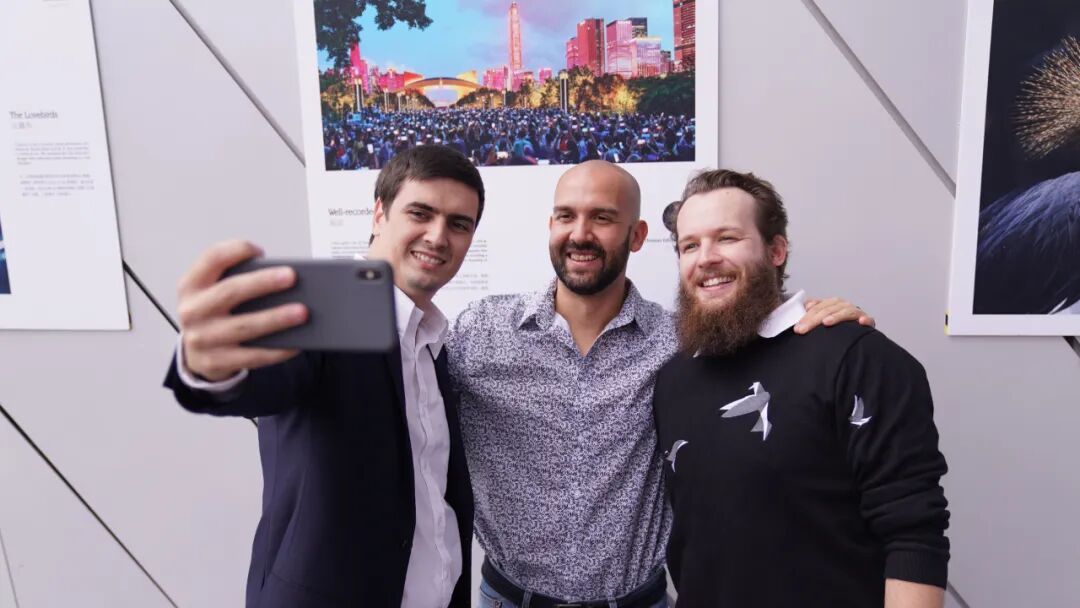 (From L) Francisco Vergara from Chile, Isaac Cohen from Colombia and Ashley Main from the U.K. pose for a selfie at the awards ceremony in Bao'an District.