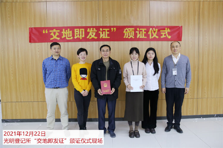 2021年12月,光明区人民政府在办理了交地手续后的一小时内,便领取到了深圳市不动产登记中心光明登记所为其颁发的不动产权证书,首尝“交地即发证”新服务,标志着深圳不动产登记正式步入“交地即发证”时代。